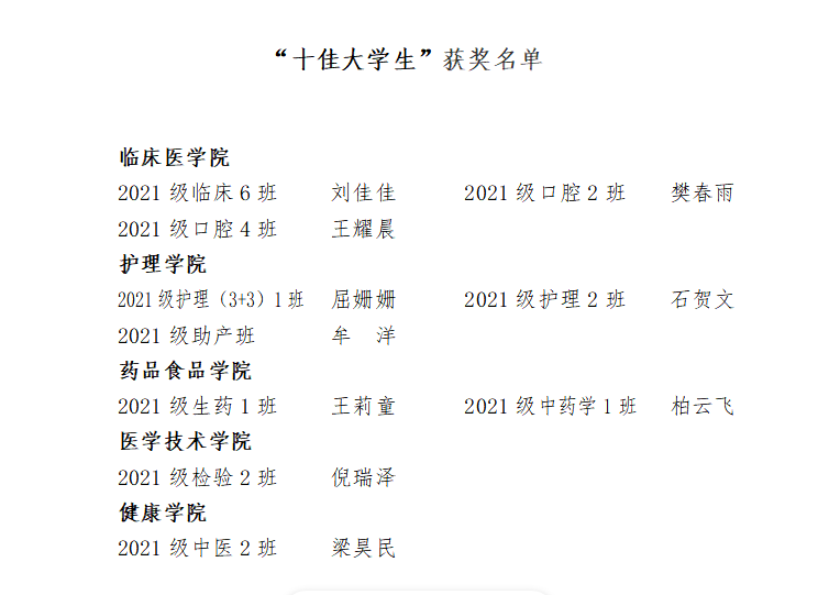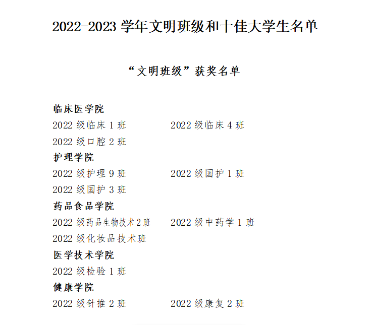 根据我校《2022-2023学年文明班级和十佳大学生评选表彰方案》,经个人和集体申报,院部推荐,学校评审小组审核,校长办公会讨论,决定授予2022级护理9班等12个班级“文明班级”荣誉称号,授予2021级临床6班刘佳佳等10名学生“十佳大学生”荣誉称号。现将获奖集体和个人进行公示,具体名单见附件。